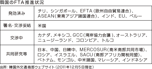 日本の環太平洋経済連携協定(TPP)参加議論が起きて以来、韓国の果敢な自由貿易協定(FTA)戦略が注目されるようになった。その特徴は経済・外交両面の得失を冷静に計算して交渉相手を選定し、強いリーダーシップのもとに同時多発的に展開している点である。これまでのFTA展開の成果は下の表のとおりである。日本が実績をあげていない米国や欧州連合(EU)ともすでに韓国はFTAを締結した。こうした果敢な動きの背景として大きいのが輸出先の確保である。
