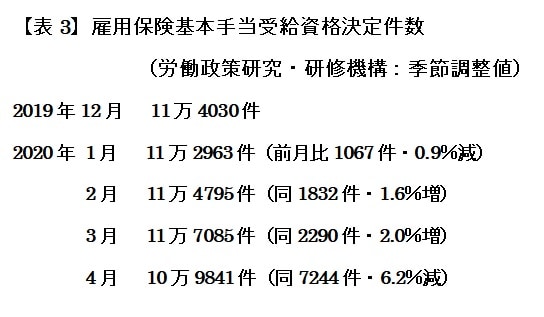 そして、失業手当の受給に至った件数である【表3】の「雇用保険基本手当受給資格決定件数」は、2、3月には1~2%程度増加したが、4月には大きく減少している。