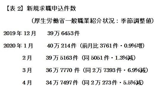 しかし一方で、公共職業安定所(以下、ハローワーク)で新規に求職の申し込みが行われた件数(「新規求職申込件数」=【表2】)は、1月こそ前月よりわずかに増加しているが、その後は減少が続いている。つまり、失業者は増加が続いているのに、なぜかハローワークで求職の手続きを行った人は減少しているということだ。
