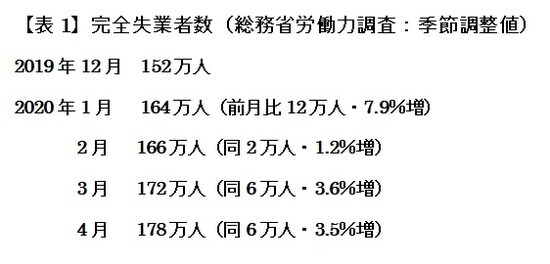 【表1】の「完全失業者数」は、2020年の年明け以降、増加の一途を辿っている。