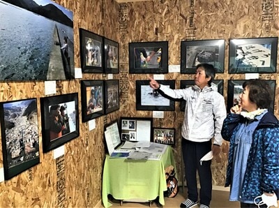 「お茶っこのみ」スペースに展示した記録写真に、歩みを振り返る田村さん夫婦(2020年10月12日)