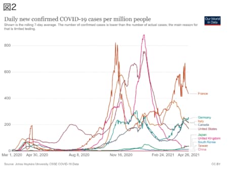 日本でも感染が拡大している。4月25日、政府は東京と関西3府県を対象に、緊急事態宣言を発令した。第3波での緊急事態宣言の解除(3月21日)から35日での再宣言に対し、「油断によるリバウンド」との指摘が多いが、私はそうは思わない。なぜなら、世界の多くの地域で同時に感染が拡大しているからだ。世界中が一斉に油断したとは考えにくい。