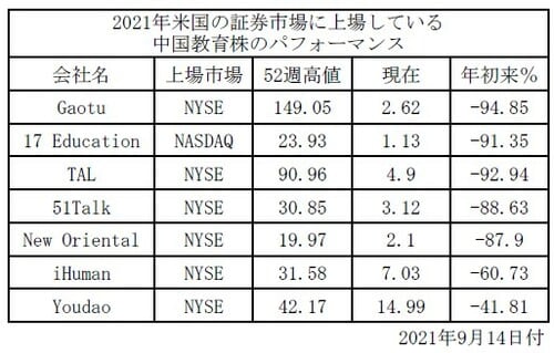 昨年年初には新型コロナウイルスの出現により、オンライン教育全体が脚光を浴び、中国でもEdTech(Education Technology)は消費や、バイオと並んで最も投資を集めた領域だった。しかし、双減政策の発令によって教育株は軒並み暴落。8月31日には学習塾大手である「巨人教育」が経営難に陥り、倒産を発表した。