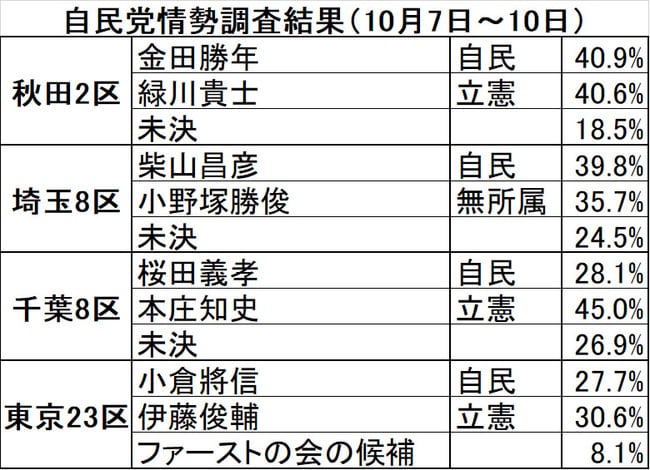 同じく、前回は自民が希望の党、共産との三つ巴の戦いを制した東京23区は今回、自民対立憲の一騎打ちとなり、自民の10月の情勢調査では、立憲候補の伊藤俊輔氏が自民候補の小倉將信氏に数ポイント先行するようになっている。