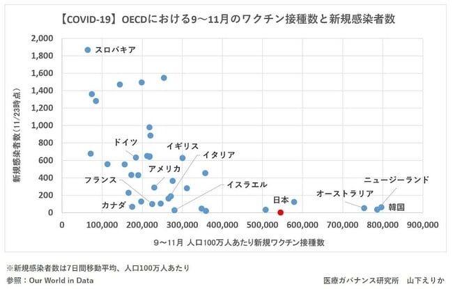 世界は、イスラエルを範とした。11月27日現在、主要国の追加接種完了率は英25.1%、米11.1%、独10.3%、伊9.6%、仏9.3%、韓5.4%、中国4.6%だ。東南アジアでもマレーシア6.6%、タイ4.6%など、接種が進んでいる。彼らは、冬の流行本番までに、何とか医療従事者や高齢者に接種しようと考えている。これは医学的に合理的だ。