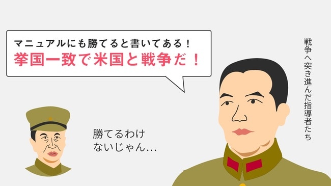 さらには、「必勝の信念」がエスカレートして、「敵を殲滅できずとも味方が殲滅されるまで戦い続ける」というとんでもない哲学が生み出されていきます。いわゆる玉砕精神です。