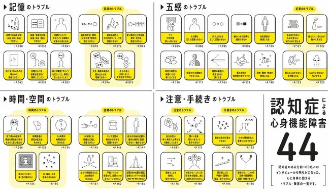 今お見せした4つのピクトグラムは、認知症のある方へのインタビューを通じて明らかになった、下記のような44の認知機能障害を表すものの一つです。