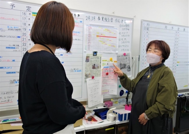 事務所の壁に「人口12,023 居住人口1,833」と、今年2月1日現在の町勢データが貼られている。震災前から約4000人が減り、実際の居住者は「帰還した町民が約1000人、残る半々が町外からの移住者と、(福島第一原発の)廃炉作業や除染、解体などの工事関係者。異なる背景の住民が今の富岡をつくっています」と代表の青木淑子さん(74)が語った。