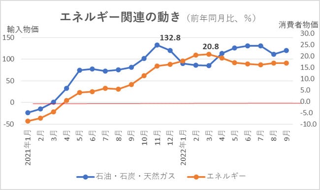 また、国内企業物価指数のうち輸入物価の「石油・石炭・天然ガス」と、消費者物価指数の「エネルギー」の動きを重ね合わせて比較すると、石油・石炭・天然ガスは21年11月に前年同月比132.8%上昇でピークを付け、消費者物価指数のエネルギーも22年3月に同20.8%上昇でピークとなった。【図2】