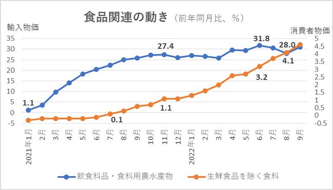 飲食料品・食料用農水産物は22年6月に前年同月比31.8%上昇のピークを付けたが、この時、生鮮食品を除く食料は同3.2%の上昇となっている。翌7月に飲食料品・食料用農水産物は同30.5%に上昇率が下落するが、生鮮食品を除く食料は同3.7%に上昇しており、上昇が続いている。