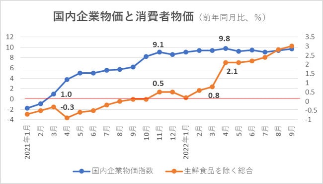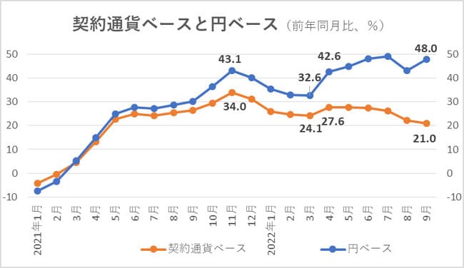 そして、直近の9月では契約通貨ベース同21.0%上昇、円ベース同48.0%上昇と27.0%ポイントにまで拡大している。つまり、円ベースの企業物価の上昇幅の方が大きく、これは円安進行の影響によるものということがわかる。