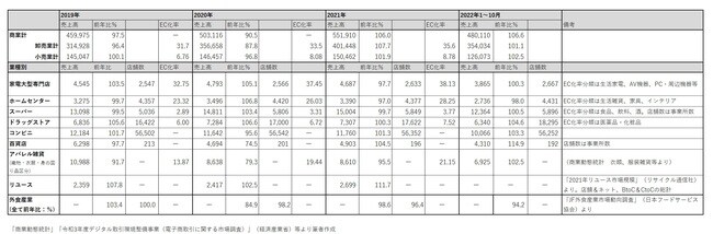 小売業も同様である。コロナ前の2019年から2022年10月時点までの各種統計をまとめた筆者作成の小売・飲食統計を見ていただきたい。商業計には小売業と卸売業の分類を設けたが、20年にいずれも減少し、21年から22年にかけてようやく落ち込み分を取り戻してきた感じだ(経済産業省の商業動態統計の集計ロジックが変わっているので売上高よりも前年比を見ていただきたい)。