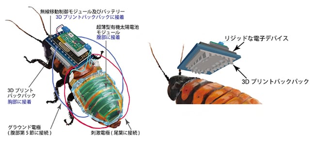 理化学研究所の研究者をはじめとするチームが2022年9月、「サイボーグ化」されたゴキブリに極薄の太陽電池を実装することに成功したと発表した。「サイボーグ化」とは、生きたゴキブリにBluetoothを使った無線通信装置を背負わせ、指示した方向に動かすことができる技術である。通信装置は、ゴキブリのお尻の両側にある感覚器官を刺激し、右側を刺激するとゴキブリは右へ進路を曲げる。ゴキブリ本来の運動能力を損なわずに、再充電し無線通信で動きを操作できることがポイントだ。