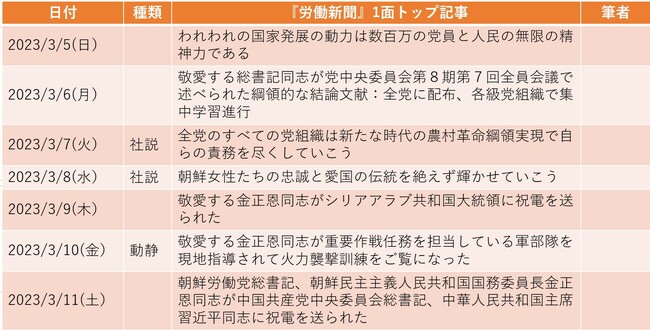 3月9日付1面トップに掲載されたのは、金正恩(キム・ジョンウン)「国務委員長」からシリアのバッシャール・アル・アサド大統領への祝電であった。シリアの「3月8日革命」60周年に際して送られたものである。前月には故・金正日(キム・ジョンイル)国防委員長の81回目の誕生日(2月16日)に際してアサドから送られた祝電(2月15日付1面下段掲載)に対する答電が2月24日付1面トップに掲載されたばかりである。……