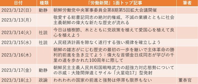 3月13日から23日まで11日間の予定で米韓合同軍事演習「フリーダム・シールド」が始まった。春季定例演習としては5年ぶりの大規模な野外機動訓練であり、北朝鮮側は強いトーンで何度も不快感を表明してきた。12日付1面トップは、前日に金正恩(キム・ジョンウン)朝鮮労働党総書記「指導」のもと開催された朝鮮労働党中央軍事委員会拡大会議において、「戦争抑止力をより効果的に行使し、威力的で攻勢的に活用するための重大な実践的措置」について討議されたことを報じており、16日にはICBM(大陸間弾道ミサイル)「火星砲17」型の発射実験が行われた……