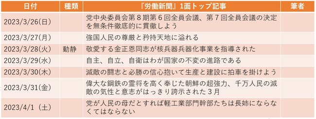 3月28日付では、小型化した核弾頭と見られる「火山31」を前に金正恩(キム・ジョンウン)総書記が核兵器研究所からの説明を受ける様子が報じられた。爆発する「火山」なるネーミングは初めて公表されたが、「31」が何を意味するのかは分からない。2016年、2017年の核実験の前には同じように核弾頭を前にした金正恩氏の写真が公開されていたため、核実験強行の予兆ではないかと見る動きもあるが、当時と異なり今回は核実験を直接示唆する表現が見当たらない。……