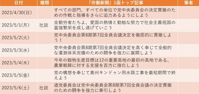 5月6日付に掲載された社説は、「道党委員会は党中央委員会第8期第7回全員会議の決定貫徹のための闘争を強力に牽引しよう」と題された。……