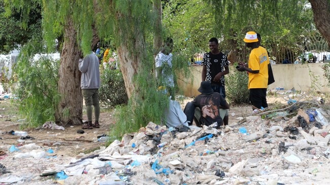 風が吹くたびに異臭が拡散し、ポリ袋が舞う。そんな地元住民が寄り付かなくなった園内に、青年がたむろしていた。数人で立ち話をしたり、毛布をかぶって寝ていたり、椅子に腰かけてぼんやりしたりしている。ほとんどが戦闘勃発後にスーダンから逃れてきた若い黒人男性で、150人ほどいるという。アラブ系が多数派のスーダンだが、この街は少数派の黒人の脱出先となっていた。