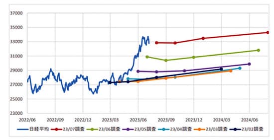 一目瞭然。1年後の日経平均の予測値は、4月時点の2万9301円→5月時点の2万9885円→6月時点の3万1807円→7月時点3万4290円に。1年後の予想値は4カ月間で5000円近く跳ね上がった。日経平均の高騰とともに、市場参加者の株価予想もうなぎ登りに上昇したのだ。