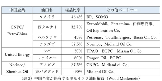 このような状況下でも活発にイラク石油産業での活動を続けるのが中国企業である。中国石油天然気集団公司(CNPC)は南部ルメイラ油田、西クルナ1油田などの大規模油田で権益を有し、イラク有数の外国石油企業の地位を確立している。また近年、国営企業の海外での石油・ガス事業活動が慎重になっていく中でも、中国の中小企業は積極的に鉱区取得に努めている。2018年に実施された最新の鉱区入札では中国のユナイテッド・エナジーとジオジェイドが、落札された6鉱区のうち半数を獲得している。欧米企業が撤退傾向を強める中、イラクにおける中国企業のプレゼンスはますます拡大している。
