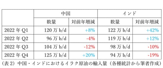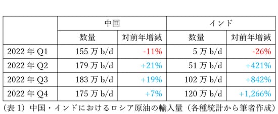 他方、インドでは市場シェア第1位を保ってきたイラク原油は、ロシア原油との価格競争に負け、徐々に市場シェアを減少させている。インドのハルディープ・シン・プリ石油相は10月に「誰かからロシア原油の購入をやめるよう言われたか? 答えは絶対に『ノー』だ」と述べ、他の原油と比べて大幅にディスカウントされたロシア原油の購入に意欲的であることを示した。インドは2023年5月時点で日量200万バレル程度のロシア原油を購入しており、このままのペースで輸入を続けた場合、2023年にはロシアがイラクに代わってインドでの年間市場シェア第1位に躍進する可能性が高い。