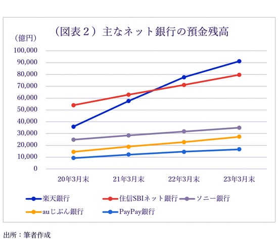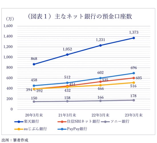 ネット銀行最大手の楽天銀行。同行の預金口座数が6月に1400万口座を突破した。2020年3月末時点では、まだ868万口座だった。コロナ禍のわずか3年余りで500万以上もの新規口座を獲得しており、預金口座数で3メガバンクに次ぐりそなホールディングス(グループ合算で1650万口座)を抜き去る勢いだ。口座数の増加に伴って、預金残高もこの3年間で3兆5756億円から9兆1298億円へと急増した。他のネット銀行でもコロナ禍で預金口座数と預金残高を大幅に増やしている(図表1、2)。
