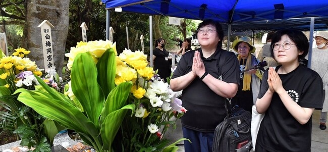 沖縄の組織的な戦闘が終結したとされる6月23日、糸満市にある白梅学徒隊の慰霊碑(白梅之塔)の前で手を合わせる。どこからともなく聞こえる三線の音色。それに合わせて、もの悲しい女性の歌声が、終戦から78年の夏空に響き渡った。