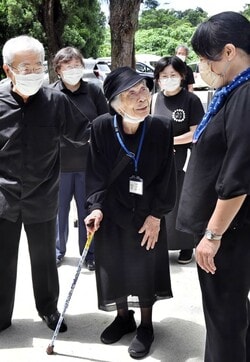 その時、同級生の武村豊(とよ)さん(94)が、慰霊祭に出席するため、到着した。仲良しだったきくさんを亡くして、少しやつれたように見え、杖をつく足元もおぼつかない。ただ、コロナ禍で面会ができなかったので、3年ぶりの再会に心が躍った。駆け寄ると、満面の笑みで迎えてくれる。