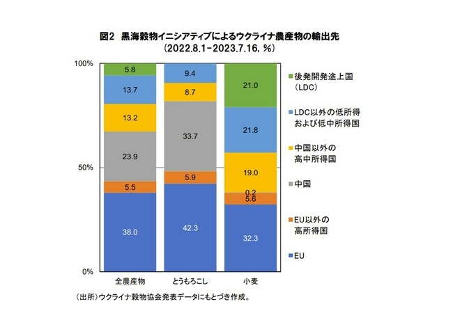 7月17日にロシアが最終的に合意離脱を発表した際にも、その主張が繰り返された。黒海穀物イニシアティブで輸送された農産物のうち、70%以上がEUをはじめとする高所得および高中所得国に向かっており、エチオピア、イエメン、アフガニスタン、スーダン、ソマリアに代表される最貧国の比率は3%以下にすぎないというのが、ロシア外務省の指摘であった。