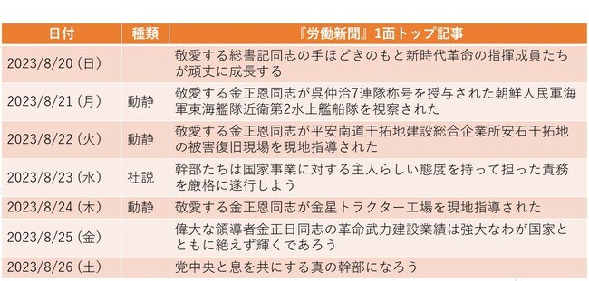 引き続き金正恩(キム・ジョンウン)総書記の動静報道が多い。8月24日付1面トップは、南浦(ナンポ)市にある金星トラクター工場を現地指導したとのニュースであった。同工場は3代の最高指導者が何度も足を運んできた主力工場の1つであり、農業分野重視の表れである。