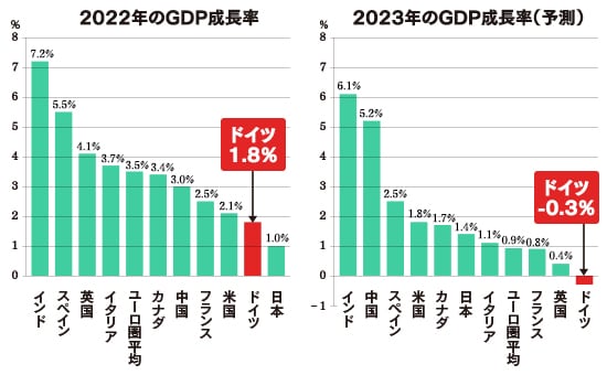 IMFの予測によると、ドイツの2022年のGDP成長率は1.8%だったが、2023年にはマイナス0.3%に下落する。ユーロ圏の2023年の予測成長率は0.9%なので、ドイツはユーロ圏全体の成長率を引き下げていることになる。