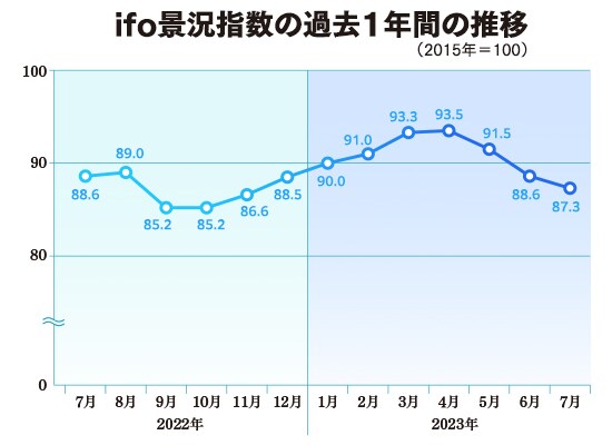 ミュンヘンのifo経済研究所が毎月公表している景況指数は、この国の企業経営者たちの、景気の先行きについての見通しを示すバロメーターだ。同研究所は、7月25日に「2023年7月の景況指数は、今年4月から3カ月連続で下降し、87.3になった」と発表した(指数は、2015年を100としている)。