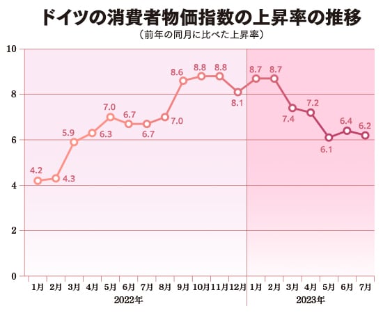 欧州中央銀行(ECB)はこの物価上昇に歯止めをかけるために、過去1年間に政策金利を9回引き上げた(現在は4.25%)。インフレ率は下降傾向を見せているものの、2023年7月のインフレ率は、6.2%とまだ高い水準にあり、ECBの目標値(2%)を大きく上回っている。ドイツのインフレ率がこの水準では、ECBはまだ手綱を緩めることはできないだろう。ドイツの論壇では、「ECBのゼロ金利政策から金融引き締めへの切り替えのタイミングが遅れたことのツケを、消費者や企業が払わされている」という指摘も出ている。