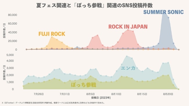 次のグラフは、今年の7月から8月にかけて開催された音楽の夏フェスに言及した投稿の件数と、「ぼっち参戦」「エンカ」を含むSNS投稿件数の推移を並べたものです。