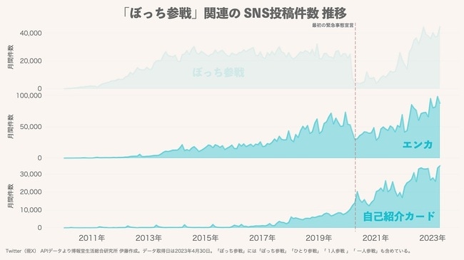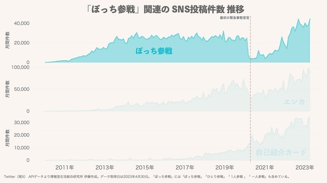 「ぼっち参戦」は2012年から2013年にかけて投稿数が増え始め、2014年以降は月間2万件前後の投稿が続いています。コンサート類の開催自体がぐっと減ったコロナ禍で一旦落ち込みますが、まもなく再び増加し、2023年に入ると過去の2倍近い投稿件数に達しているようです。