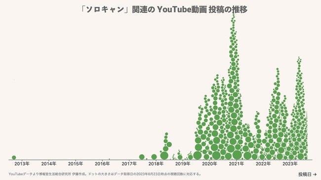 YouTubeでも「ソロキャン」「ソロキャンプ」を検索すると、ソロキャンプのやりかたや道具について解説したたくさんの動画がヒットしますが、それらの各動画が投稿された時期を時間軸上に可視化してみたのが次のドットグラフです(ドットの大きさはデータ取得時点の視聴回数に対応させています)。