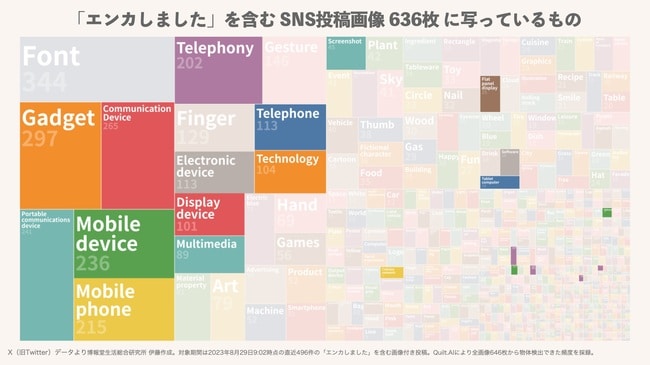 次のグラフは「エンカしました」を含むX投稿画像636枚を収集し、AIを用いて写っているものの物体検出を行った結果を可視化したものです。ご覧のように、上位には「ガジェット」「コミュニケーションデバイス」などスマートフォンやその画面に関連するものが並んでいることがわかります。