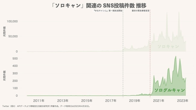 「単独でキャンプする人は上級者やライダーを中心に以前から存在した」というのはよくなされる指摘ですが、データからみえてくるのは、この作品をきっかけとしてひとりでキャンプする人が増えるにつれ、同じ行動が「ソロキャン」「ソロキャンプ」という語彙によって肯定的な意味を伴いながら再定義されていったプロセスです。