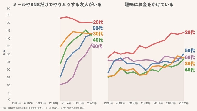 では生活者は何に関心をふり向けているのでしょうか。次のグラフは「メールやSNSだけでやりとりする友人はいますか?」という質問に「いる」と答えた人の割合と、「現在、何にお金をかけていますか?」という質問に「趣味」と答えた人の割合の時系列推移を視覚化したものです。
