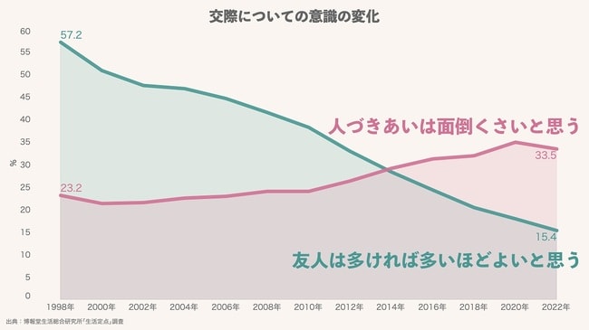 ご覧のようにかつて6割近くあった友人数の多さへの肯定的な意識が、24年間で一貫して低下し続けています。一方で次第に上昇してそれを逆転してきたのが「人づきあいは面倒くさいと思う」です。ここからは、友だち疲れとも言える人間関係がもたらすストレスの回避の傾向をはっきりと読み取ることができます。