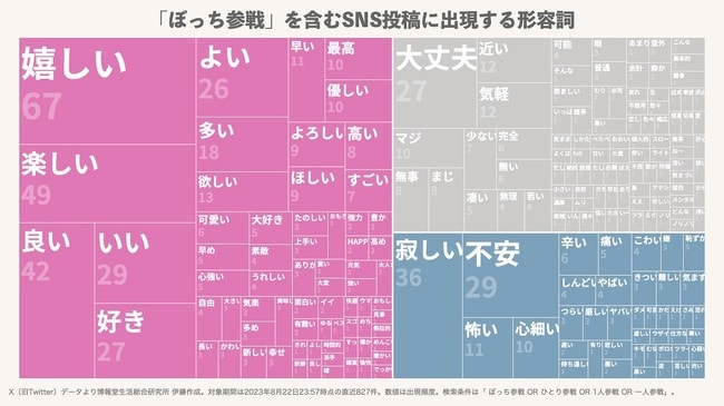夏フェスの投稿件数は開催日前後に顕著なスパイク(数値の急増)がみられるので、現地に参加している人を中心に多くの投稿がなされていた様子がうかがえます。一方、「ぼっち参戦」「エンカ」も同じタイミングにピークがみられます。次のグラフは同時期に「ぼっち参戦」関連の語を含んでSNSに投稿された827件の本文を自然言語解析し、一緒に使われている形容詞の頻度を算出して面積として可視化したものです(ツリーマップといいます)。