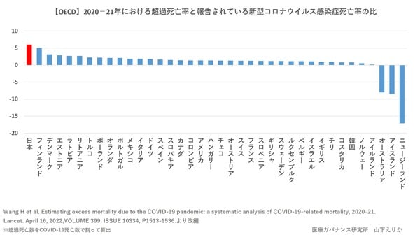 実は、このことは既に海外からも指摘されていた。2022年3月10日に、米ワシントン大学の研究チームが、英『ランセット』誌に74カ国と地域を対象に、2020年1月から21年12月までの超過死亡を推定した論文を発表した。この研究で、日本の超過死亡数は11万1000人と推定され、確認されたコロナによる死者1万8400人の6.0倍だった。この数字は、経済協力開発機構(OECD)加盟38カ国中で最大だった(図1)。