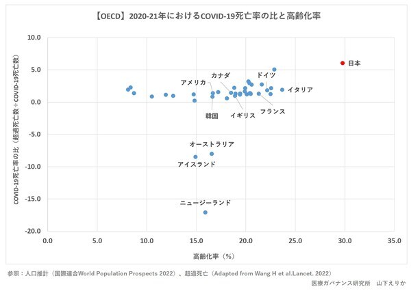 ただ、ドイツ(22.4%)、フランス(21.7%)のような高齢化が進んだ先進国で、コロナ禍の間に、それぞれ0.27%、0.35%人口が増加している。移民の影響もあり、日本との単純な比較には注意を要するが、この差は注目に値する。図2は主要国の高齢化率と、超過死亡数とコロナ死亡数の比率の関係を示した図だ。日本の状況が如何に特殊かご理解いただけるだろう。
