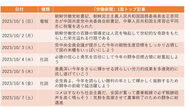 10月2日付の第1面は、「朝鮮労働党の百勝の領導史は人民を喚起して世紀的な奇跡をもたらした栄光溢れる行路である」と題する長文論説が飾り、金正恩(キム・ジョンウン)国務委員長が金永日(キム・ヨンイル)元朝鮮労働党中央委員会書記の霊前に花輪を送ったとの記事が第2面に追いやられた。金徳訓(キム・ドックン)内閣総理による平安(ピョンアン)道の農業部門に対する「現地了解」の記事より上位にあるとはいえ、最高指導者の動静にかかわる報道が必ずしも最優先されない傾向が散見されるのは興味深い。