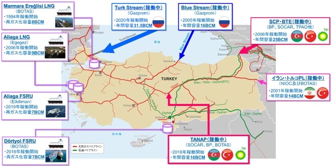 プーチン大統領がこのような提案を行った背景には、トルコがかねてより欧州諸国への「エネルギー回廊」として機能してきたことがある。トルコには図1のとおり、5本の天然ガスパイプラインと5基のLNG輸入ターミナルが集約されている。トルコが中東・欧州・中央アジアなど各地域の結節点にあたる地政学的な要衝に位置することから、イランやロシア、アゼルバイジャンといった産ガス国はトルコを南・東欧市場に向けたエネルギー輸送路として活用してきた。
