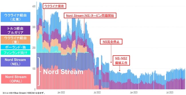 プーチン大統領による「天然ガスハブ」構想は、このトルコの二面性を最大限に活用するものだと推測されている。ロイターはこの構想について、欧州諸国がトルコの「天然ガスハブ」を経由することで、ロシア産ガスの出自が隠される可能性を懸念していると報じた。つまり、プーチン大統領はノルドストリーム1・2に代わる「脱ウクライナ天然ガス供給ルート」として、TANAPを通じて少なくとも一部は「脱ロシア供給源」としての役割を果たしてきたトルコをいわば「裏街道」として活用する算段であると推測されている。現にノルドストリーム1・2の停止後には、トルコ経由の輸出がロシア産ガス輸出の少なくとも半分程度を占めており(図3)、ロシアはこの傾向を加速させ、さらなる欧州市場への輸出を望んでいると見られている。