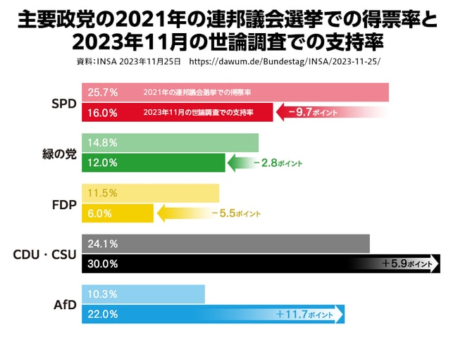 違憲判決による混乱は、政権党に対する国民の不信感を増幅した。ドイツの世論調査機関INSAが11月25日に発表した世論調査の結果によると、SPDへの支持率は、21年9月26日の連邦議会選挙での得票率に比べて9.7ポイント下がった。緑の党への支持率は2.8ポイント、FDPへの支持率は5.5ポイントそれぞれ減った。3党の支持率を合わせても34%にしかならず、過半数に達しない。