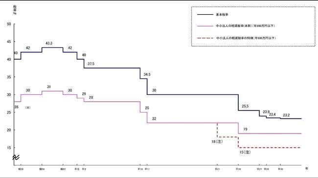 以下の図表の通り、法人税率は1987年から何度も引き下げられてきています。ただその分、財・サービスの価格が低下したと実感できる人はあまりいないのではないでしょうか。