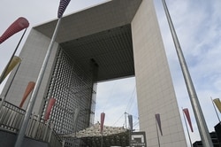 まずはナンテールを目指し、パリ中心部から地下鉄1番線に乗って西方に向かう。終点のラ・デファンス駅で降り、出口の階段を上がると眼前にグランダルシュの巨大建物が飛び込んできた。新凱旋門とも言われる、1989年に竣工した斬新な超高層ビルだ。吹き抜けの空間から東方を望むと、はるか向こうにパリ市内の凱旋門が望める。周りを見渡せば再開発された近代的な高層ビルが立ち並んでいる。移民の若者による暴動が起きた世界とはとても思えない。少し離れたところに貧しい移民地区が広がっているのだろうか。