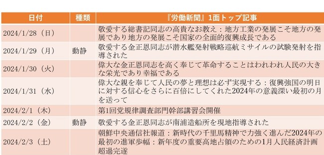 1月29日付1面は、金正恩(キム・ジョンウン)国務委員長が新たに開発された潜水艦発射戦略巡航ミサイル「プルファサル(火矢)3-31」型の発射実験を指導したとの記事であった。金正恩は、昨年9月の新型潜水艦進水式の際に掲げた「海軍の核武装化」に再び言及している。今回の実験は、「地域情勢とは全く関係なく実施された」という。北朝鮮の兵器実験が、日米韓の外交日程などに逐一タイミングを合わせているものではないとの主張であり、極超音速ミサイル発射実験に関する1月15日付の記事でも同じ表現が見られた。